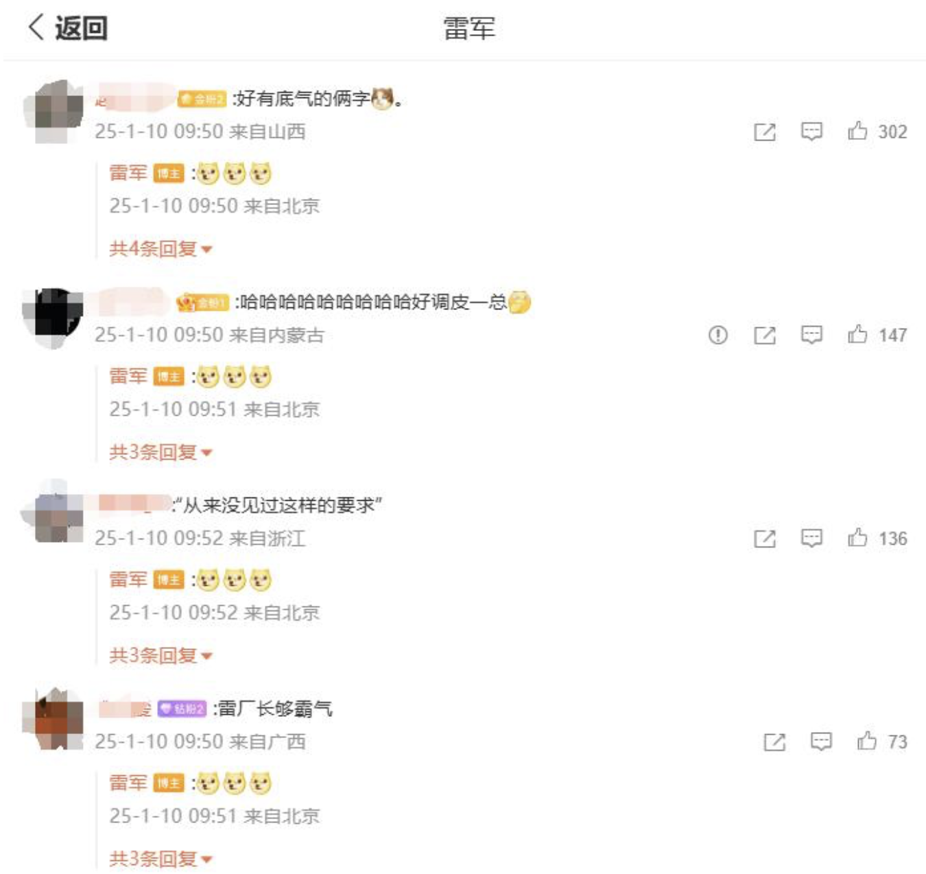 网友给雷军评论“好有底气的俩字”、“好调皮一总”、“从没见过这样的要求”、“雷厂长够霸气”,雷军均回之[doge]表情,显得自信又幽默。