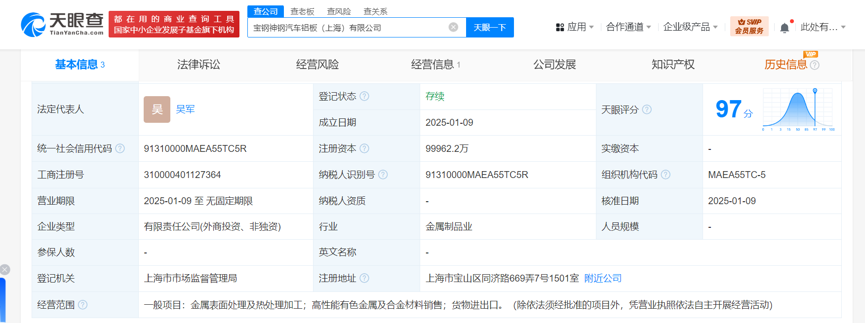 天眼查App显示,近日,宝钢神钢汽车铝板(上海)有限公司成立,法定代表人为吴军,注册资本约10亿人民币,经营范围为金属表面处理及热处理加工、高性能有色金属及合金材料销售、货物进出口。股东信息显示,该公司由宝钢股份(600019)、神钢投资有限公司、宝武铝业科技有限公司共同持股。