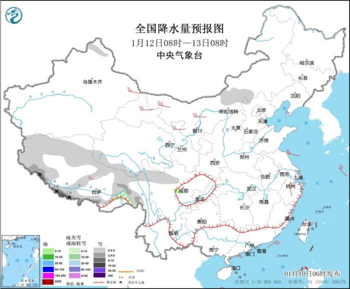 1月12日08时至13日08时,西藏大部、内蒙古中部等地部分地区有小雪或雨夹雪,其中,西藏南部等地部分地区有中到大雪,局地暴雪(10~18毫米)。西藏北部、新疆东部、内蒙古中西部、甘肃中西部、浙江中东部等地部分地区有4~6级风,阵风7~8级(见图4)。