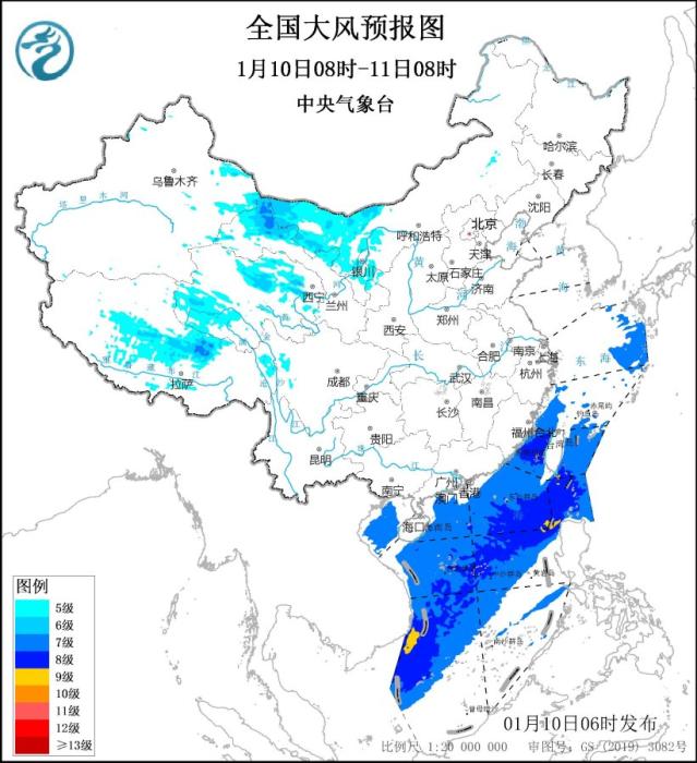 受冷空气影响,1月10日08时至11日08时,西藏大部、青海西南部和北部、川西高原西部以及甘肃中西部、内蒙古中西部、宁夏等地部分地区有5~6级风,阵风7~8级;东海大部海域、台湾海峡、巴士海峡、台湾以东洋面、南海大部海域、北部湾将有7~8级、阵风9~10级的大风,其中,巴士海峡、南海东部和西南部部分海域风力可达9级、阵风10级(见图1)。中央气象台1月10日06时继续发布大风蓝色预警。