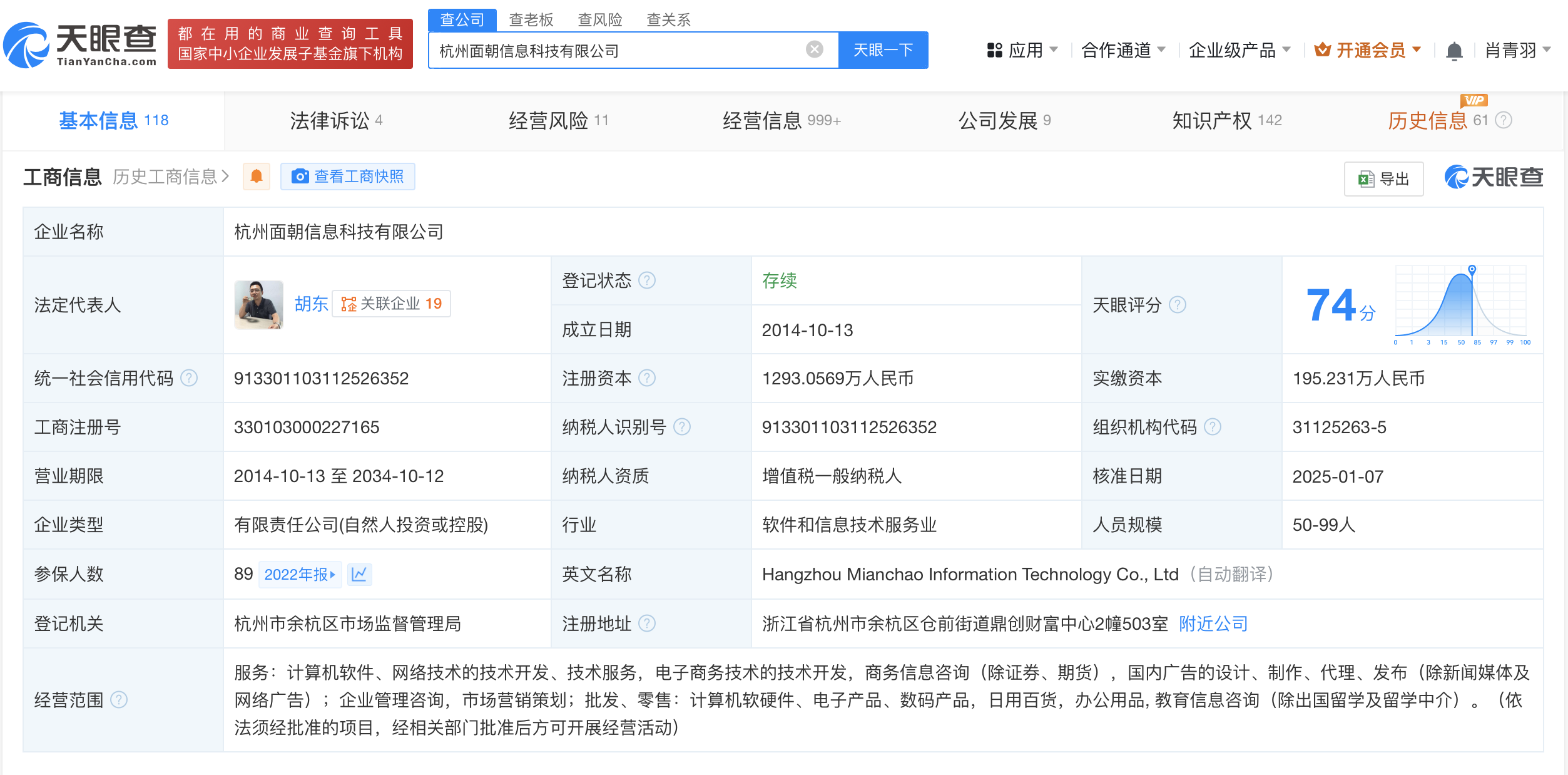 杭州面朝信息科技有限公司成立于2014年10月,法定代表人为胡东,经营范围含计算机软件、网络技术的技术开发、技术服务等,现由胡东、宁波果集创业投资合伙企业(有限合伙)等共同持股。官网显示,面朝科技是一家社交媒体全链路服务商,公司致力于将大数据、AI等新技术应用于社交媒体营销和电商领域,以数据和技术驱动品牌增长。