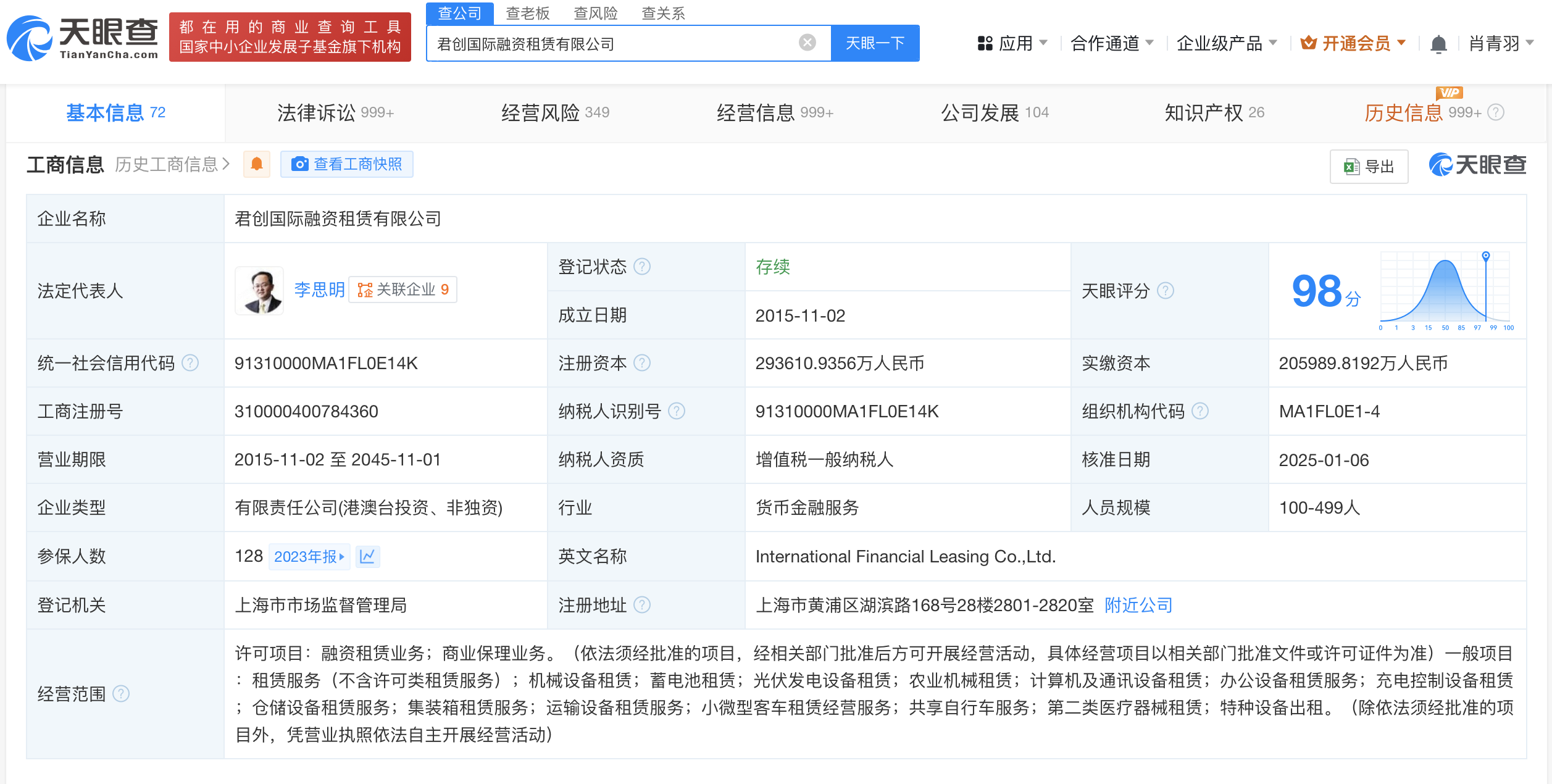 君创国际融资租赁有限公司成立于2015年11月,法定代表人为李思明,经营范围含融资租赁业务、商业保理业务、租赁服务等,现由君创金融集团有限公司、上海君清企业管理有限公司及上述新增股东等共同持股。据媒体报道,2024年12月,北京市市场监管局网站公示,阳光人寿保险股份有限公司拟收购君创国际融资租赁有限公司39.90%的股权。