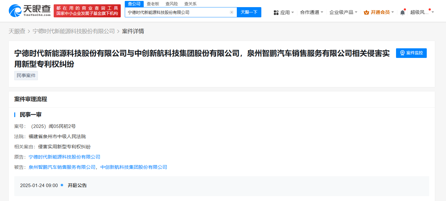 天眼查司法案件信息显示,近日,宁德时代新能源科技股份有限公司新增一条开庭公告,被告为中创新航科技集团股份有限公司、小鹏汽车销售有限公司旗下泉州智鹏汽车销售服务有限公司,案由为侵害实用新型专利权纠纷,该案将于1月24日在福建省泉州市中级人民法院开庭审理。