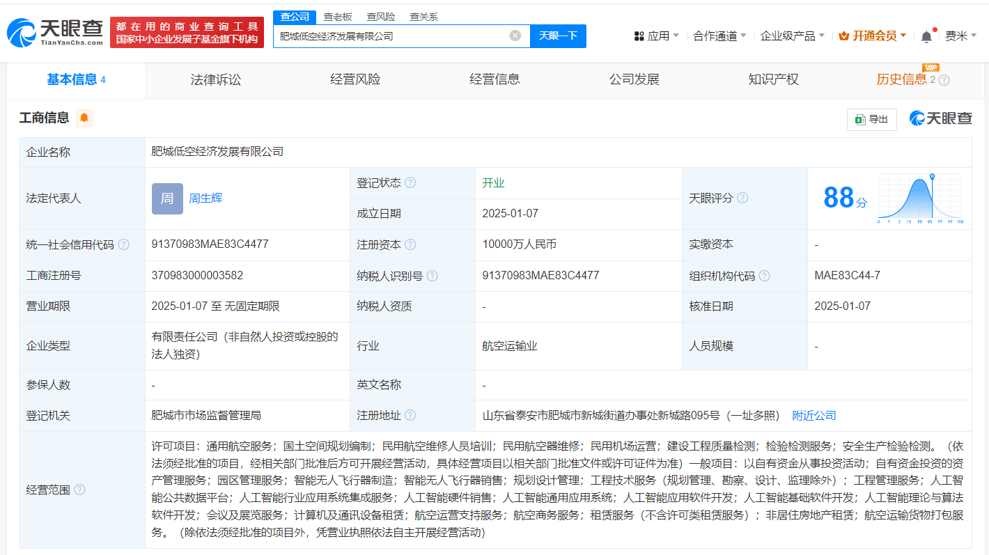 天眼查App显示,近日,肥城低空经济发展有限公司成立,法定代表人为周生辉,注册资本1亿人民币,经营范围含通用航空服务、国土空间规划编制、民用航空维修人员培训、民用航空器维修、民用机场运营、建设工程质量检测等,由肥城华裕产业集团有限公司全资持股。