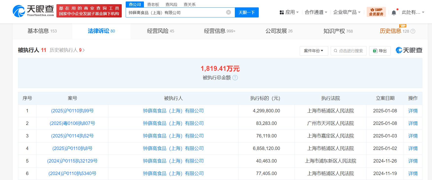 天眼查法律诉讼信息显示,近日,钟薛高食品(上海)有限公司新增2条被执行人信息,执行标的合计438.3万余元,涉及损害股东利益责任纠纷、服务合同纠纷案件,被执行人还包括钟茂(上海)食品科技有限公司,执行法院为上海市杨浦区人民法院、广州市天河区人民法院。