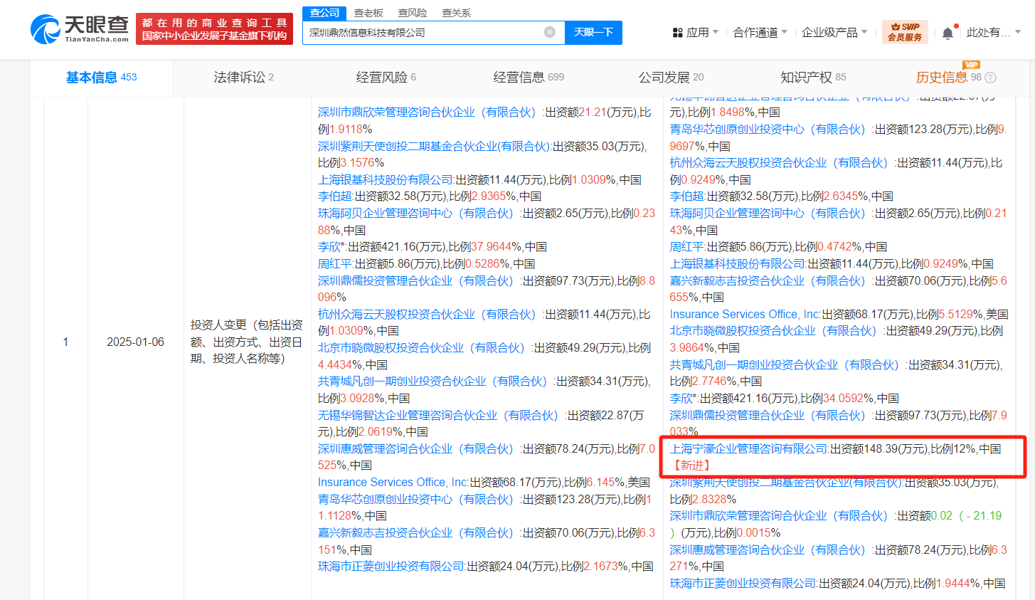 天眼查App显示,近日,深圳鼎然信息科技有限公司发生工商变更,股东新增蚂蚁集团旗下上海宁濠企业管理咨询有限公司,注册资本由约1109万人民币增至约1237万人民币,同时,部分主要人员也发生变更。