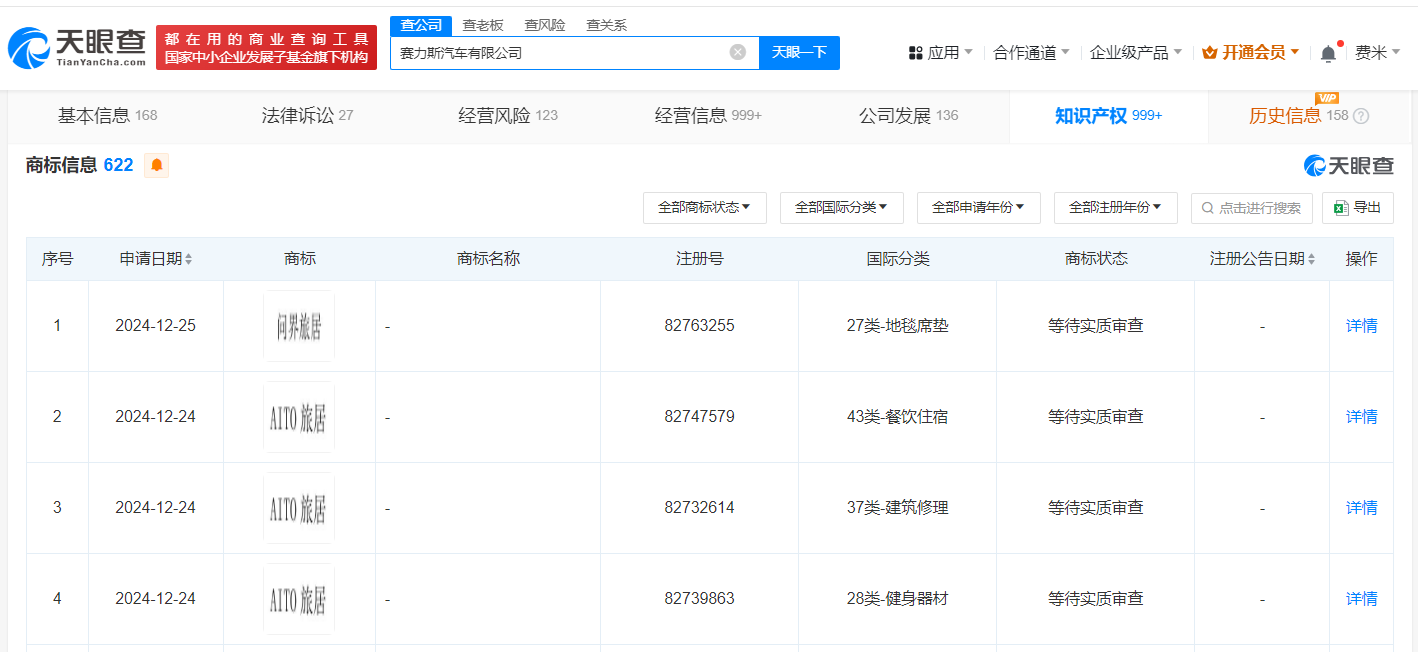 天眼查知识产权信息显示,近日,赛力斯汽车有限公司申请注册数枚“问界旅居”“AITO旅居”商标,国际分类为地毯席垫、餐饮住宿、建筑修理、健身器材,当前商标状态为等待实质审查。