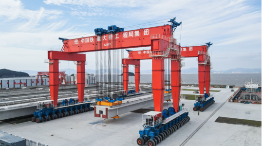 依托两台1250吨轮胎式搬梁机,制梁场平均4天就提运一榀箱梁,助力宁波舟山港六横公路大桥二期工程等两座世界级跨海大桥的快速建设。