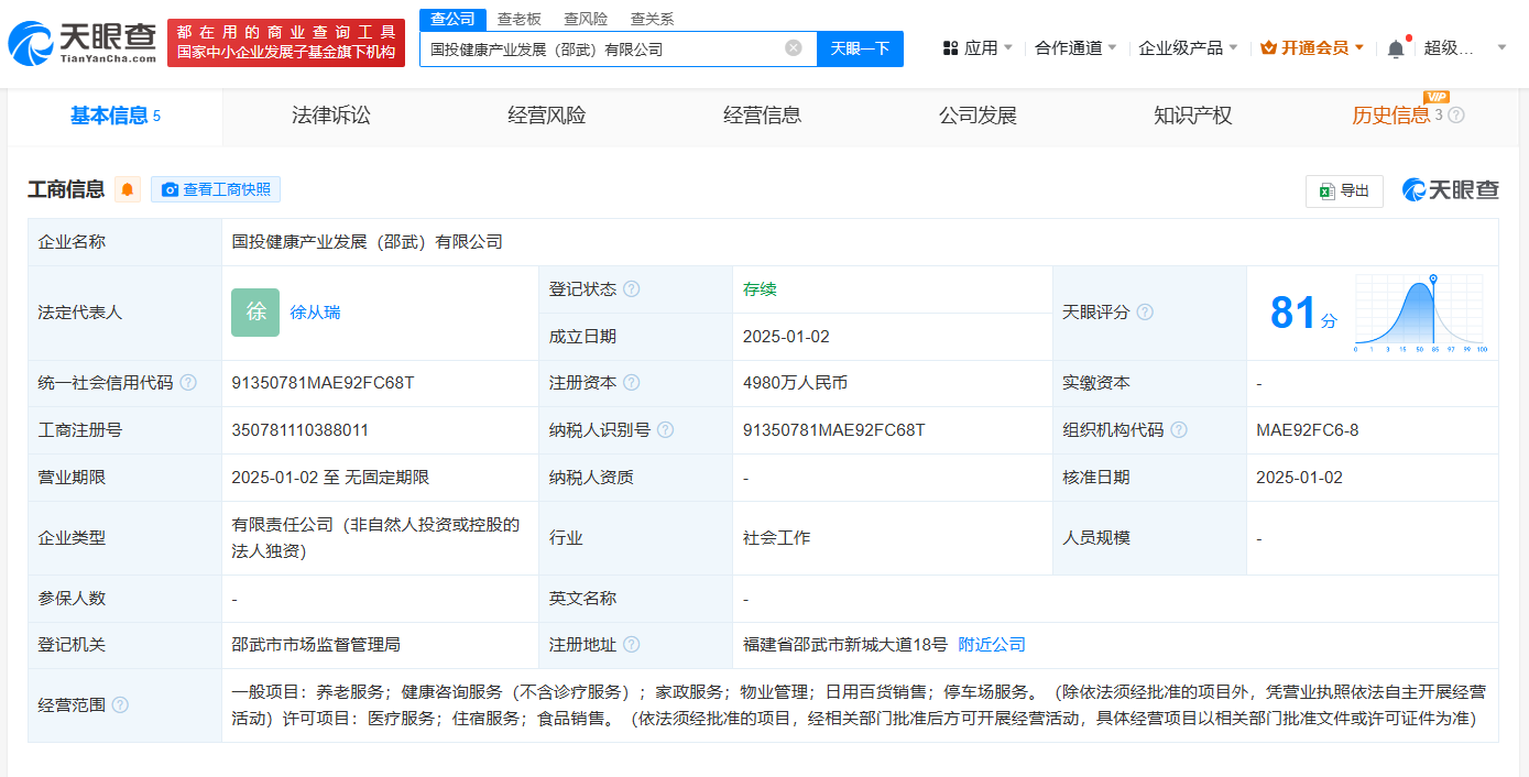 天眼查App显示,近日,国投健康产业发展(邵武)有限公司成立,法定代表人为徐从瑞,注册资本4980万人民币,经营范围包括养老服务、健康咨询服务、家政服务、物业管理等。股东信息显示,该公司由国投健康产业投资有限公司全资持股。