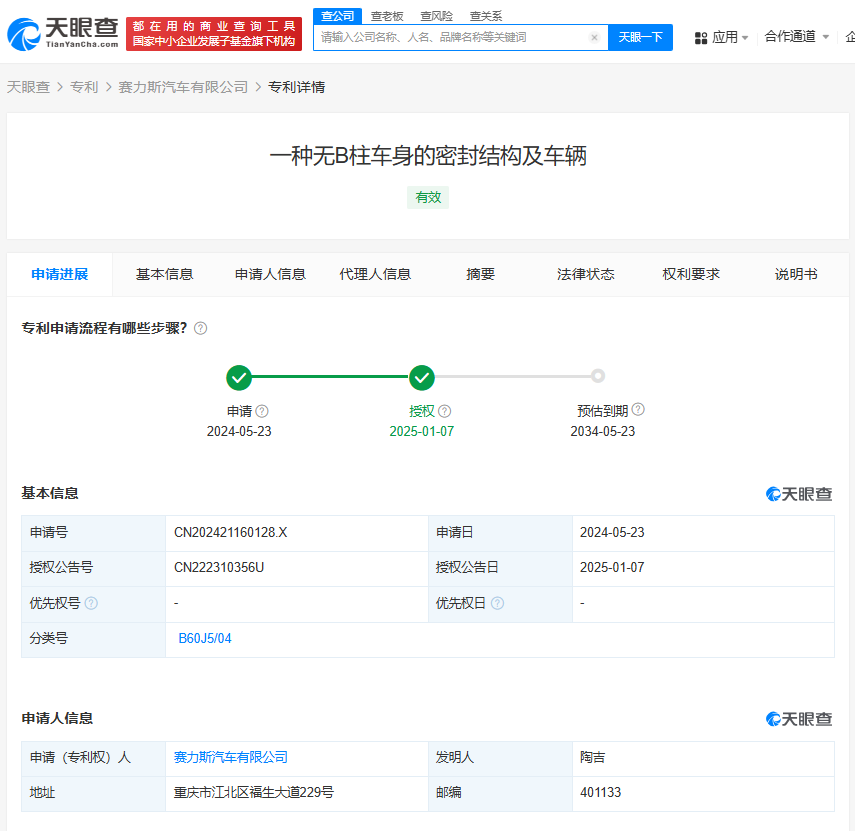 天眼查知识产权信息显示,近日,赛力斯汽车有限公司申请的“一种无B柱车身的密封结构及车辆”专利获授权。