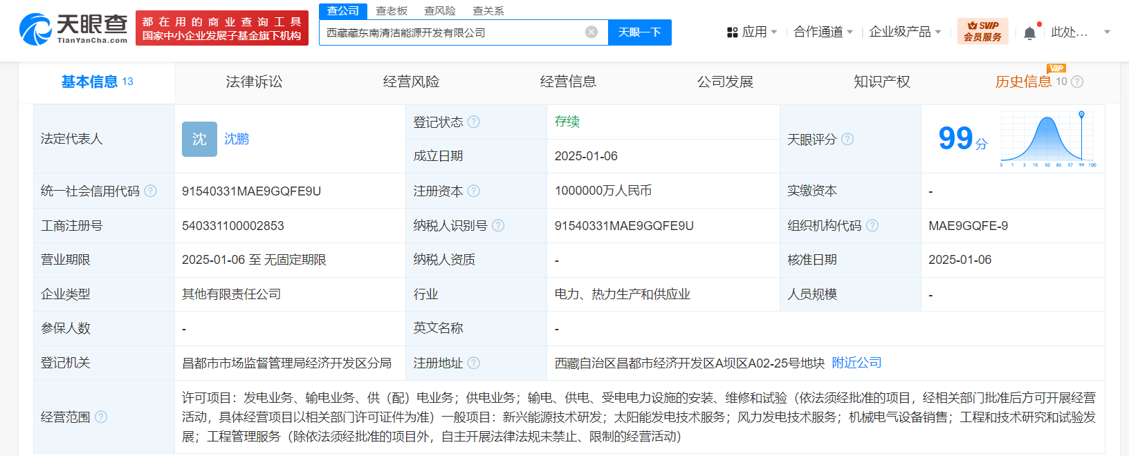 天眼查App显示,近日,西藏藏东南清洁能源开发有限公司成立,法定代表人为沈鹏,注册资本100亿人民币,经营范围含发电业务、输电业务、供(配)电业务,新兴能源技术研发,太阳能发电技术服务,风力发电技术服务,机械电气设备销售,工程和技术研究和试验发展等。股东信息显示,该公司由西藏开发投资集团有限公司、大唐集团旗下大唐西藏能源开发有限公司、中国电建(601669)旗下中电建水电开发集团有限公司共同持股。