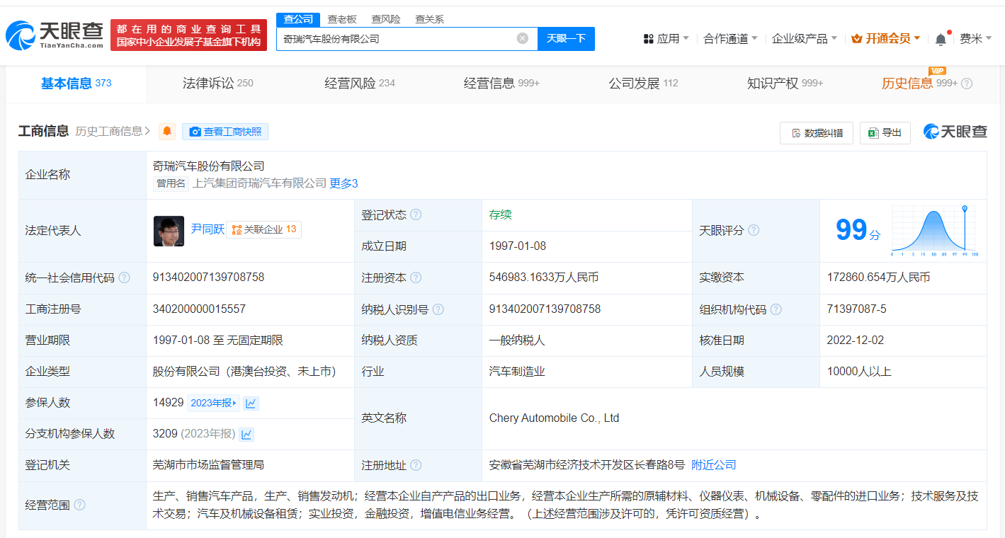 奇瑞汽车股份有限公司成立于1997年1月,法定代表人为尹同跃,注册资本约54.7亿人民币,由奇瑞控股集团有限公司、安徽省信用融资担保集团有限公司、开封城市运营投资集团有限公司等共同持股。其中,开封城市运营投资集团有限公司持股约1.83%,认缴出资额1亿人民币。
