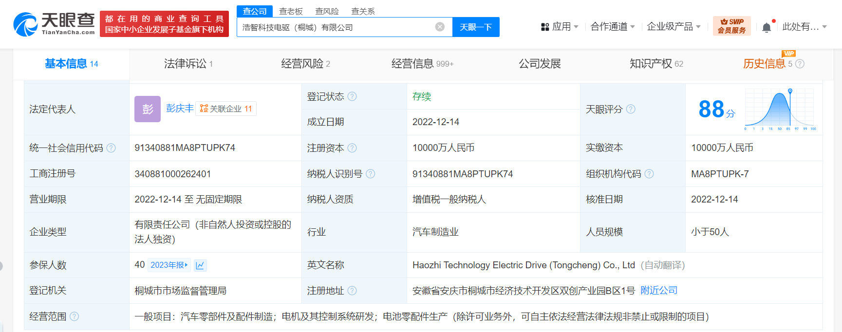 浩智科技电驱(桐城)有限公司成立于2022年12月,法定代表人为彭庆丰,注册资本1亿人民币,经营范围为汽车零部件及配件制造、电机及其控制系统研发、电池零配件生产等,由哪吒汽车关联公司合众新能源汽车股份有限公司全资持股。