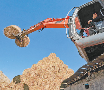 1月7日,河北省唐山市曹妃甸区第八农场稻草回收企业的工人将打好捆的稻草码垛。近年来,曹妃甸区积极探索秸秆利用新途径,将稻草集中收集用于牲畜饲料、稻草制品加工、生物质发电等,有效提高了秸秆综合利用率,促农增收,实现农业绿色循环发展。