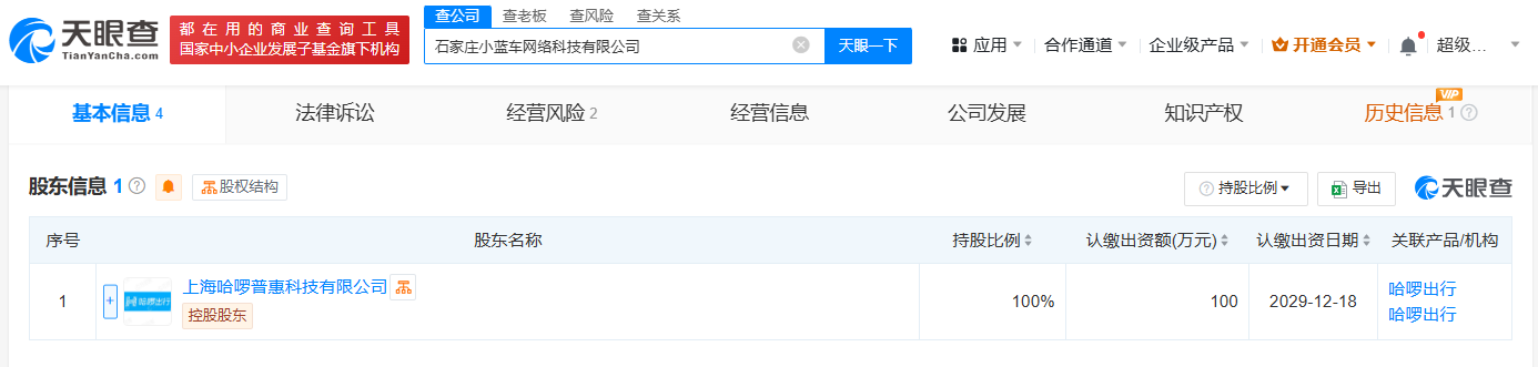 天眼查App显示,近日,石家庄小蓝车网络科技有限公司成立,法定代表人为吴传凡,注册资本100万人民币,经营范围包括共享自行车服务、小微型客车租赁经营服务、充电桩销售、电动汽车充电基础设施运营、集中式快速充电站等,由上海哈啰普惠科技有限公司全资持股。
