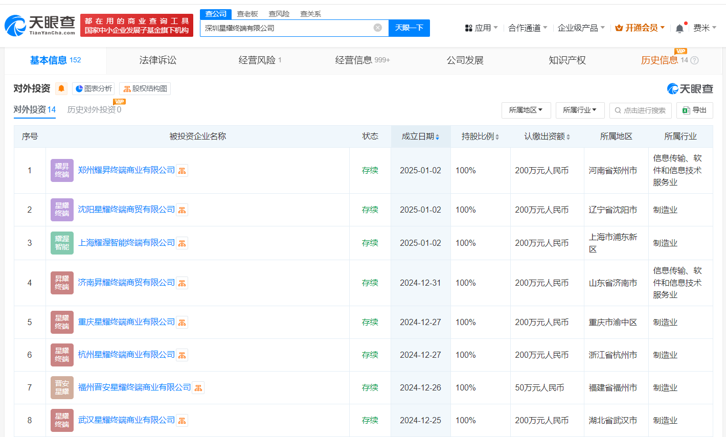 天眼查App显示,近日,上海耀渥智能终端有限公司、沈阳星耀终端商贸有限公司、郑州耀昇终端商业有限公司成立,法定代表人均为文洁,注册资本均为200万人民币,经营范围包含移动终端设备销售、家用电器销售、电子产品销售等,均由荣耀终端旗下深圳星耀终端有限公司全资持股。值得一提的是,近一个月以来,深圳星耀终端有限公司已成立10余家新公司。