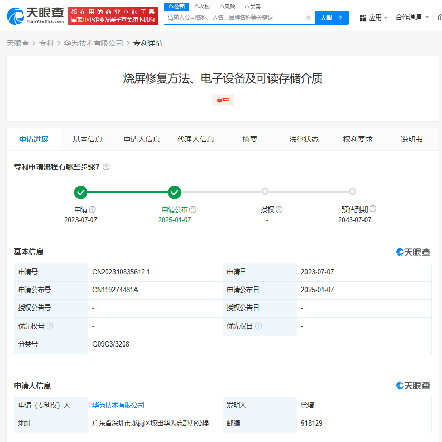 天眼查知识产权信息显示,1月7日,华为技术有限公司申请的“烧屏修复方法、电子设备及可读存储介质”专利公布。