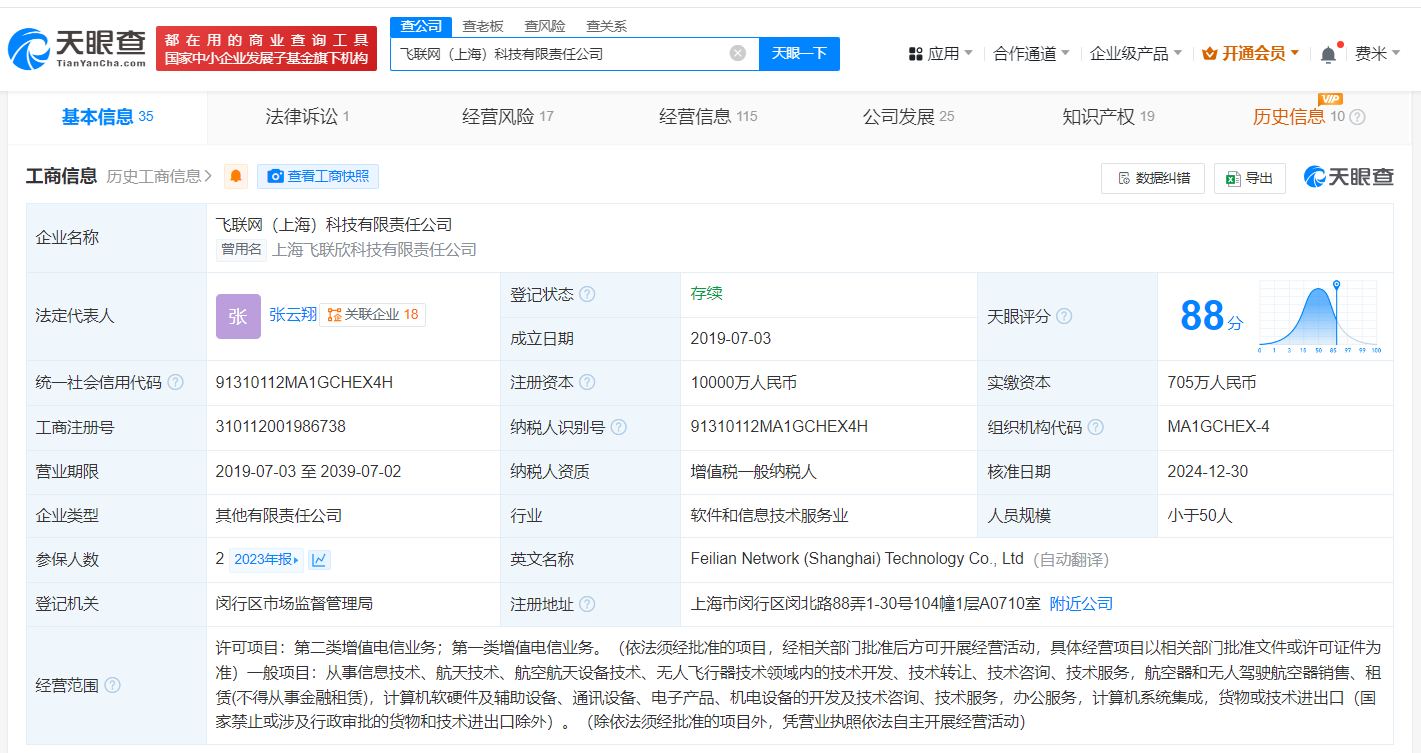 飞联网(上海)科技有限责任公司成立于2019年7月,法定代表人为张云翔,经营范围含第二类增值电信业务、第一类增值电信业务、航空器和无人驾驶航空器销售等,现由航迅信息技术有限公司、上海夏霆商务信息咨询合伙企业(有限合伙)及上述新增股东共同持股。官网显示,该公司是一家专注航空宽带互联网应用服务和运营的高技术企业。