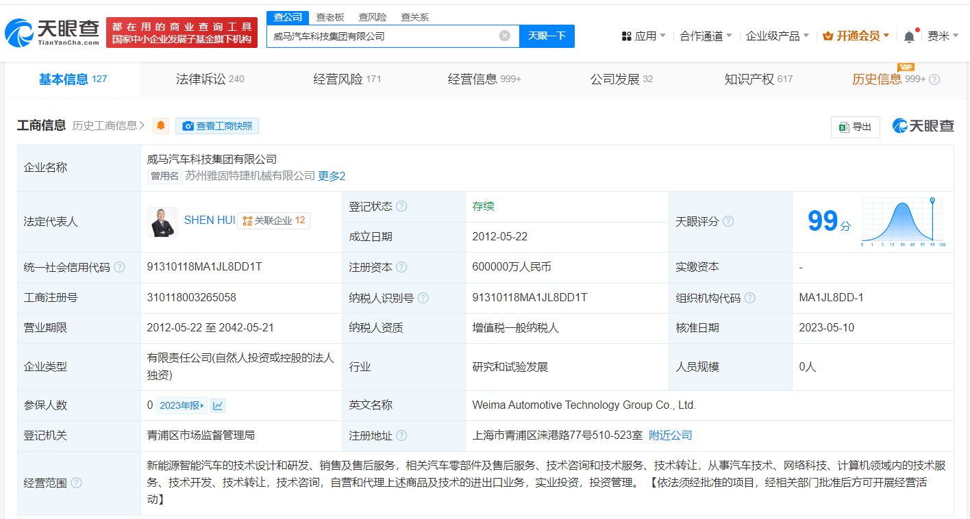 威马汽车科技集团有限公司成立于2012年5月,法定代表人为SHEN HUI,注册资本60亿人民币,由苏州威马智慧出行科技有限公司全资持股。天眼风险信息显示,该公司存在多条被执行人、股权冻结、失信被执行人(老赖)信息。
