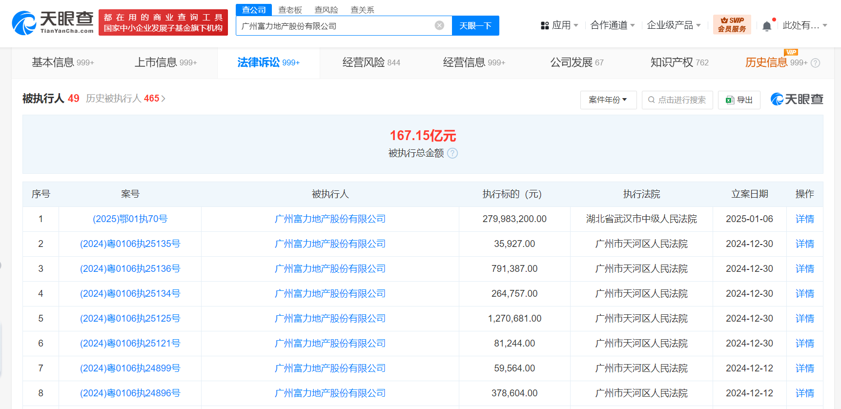 天眼风险信息显示,广州富力地产股份有限公司现存40余条被执行人信息,被执行总金额超167亿元。此外,该公司还存在限制消费令、失信被执行人(老赖)、终本案件及股权冻结信息。