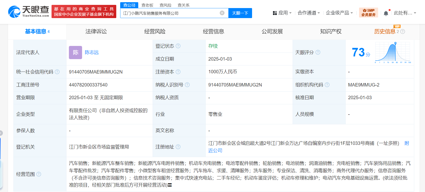 天眼查App显示,近日,江门小鹏汽车销售服务有限公司成立,法定代表人为陈志远,注册资本1000万人民币,经营范围含汽车销售、新能源汽车整车销售、新能源汽车电附件销售、电池零配件销售、小微型客车租赁经营服务、信息咨询服务、信息技术咨询服务、二手车经纪等。股东信息显示,该公司由小鹏汽车销售有限公司全资持股。