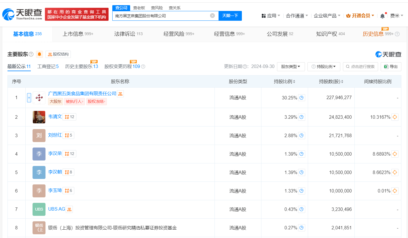 南方黑芝麻集团股份有限公司成立于1993年5月,法定代表人为李玉珺,注册资本约7.5亿人民币,经营范围含食品生产、粮食加工食品生产、保健食品生产等,由广西黑五类食品集团有限责任公司、韦清文、刘世红等共同持股。