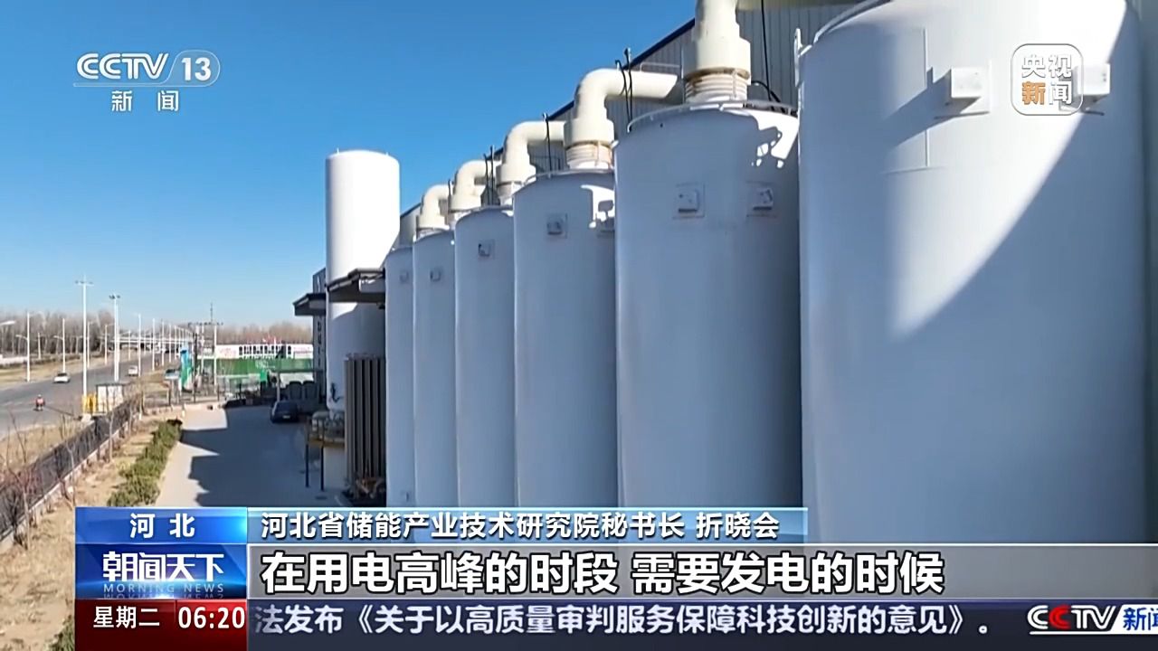河北省储能产业技术研究院秘书长 折晓会:用电的低谷时段,通过电能驱动一个制冷机,将环境空气温度降低至零下170℃,变为液态。在用电高峰的时段,需要发电的时候,将液态空气升温变为气态的空气,这样它的体积能膨胀600余倍,推动膨胀机的叶轮旋转发电。