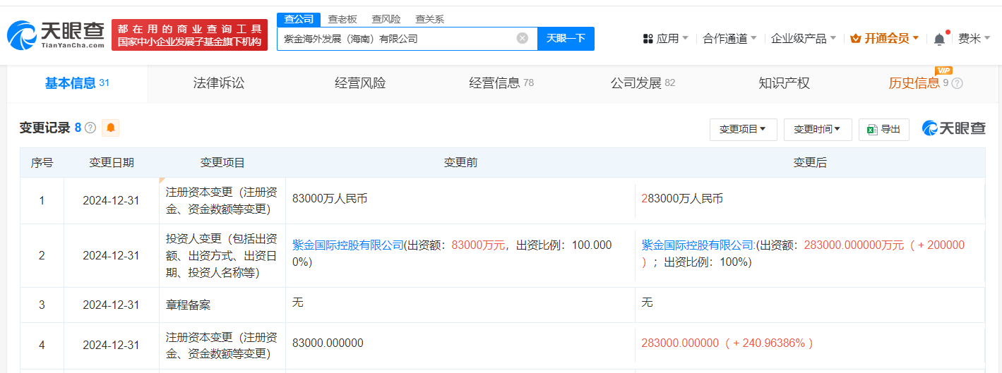 天眼查App显示,近日,紫金海外发展(海南)有限公司发生工商变更,注册资本由8.3亿人民币增至28.3亿人民币,增幅约241%。