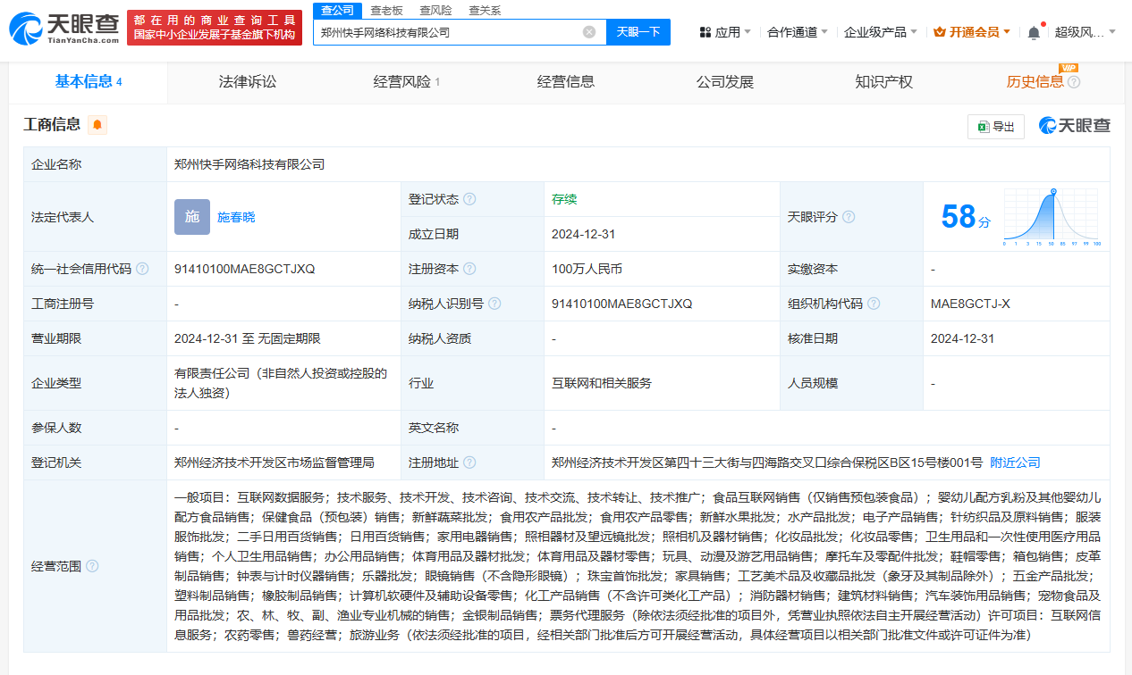 天眼查App显示,近日,郑州快手网络科技有限公司成立,法定代表人为施春晓,注册资本100万人民币,经营范围包括互联网数据服务、食用农产品零售、日用百货销售、票务代理服务等。股权全景穿透图显示,该公司由成都快购科技有限公司全资持股,后者为北京快手科技有限公司全资子公司。