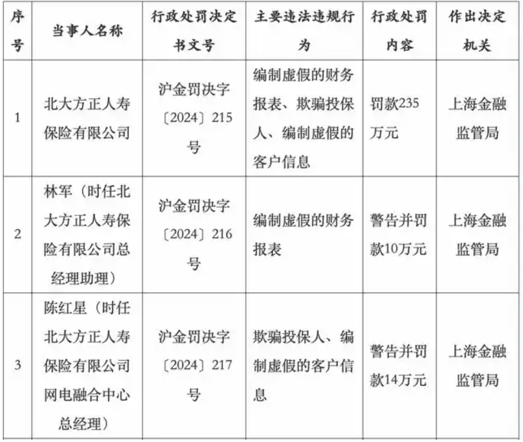 时任北大方正人寿保险有限公司总经理助理林军因编制虚假的财务报表,被警告并罚款10万元;时任北大方正人寿保险有限公司网电融合中心总经理陈红星因欺骗投保人、编制虚假的客户信息,被警告并罚款14万元。