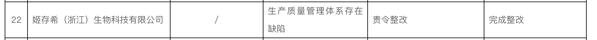 其中,姬存希(浙江)生物科技有限公司,因生产质量管理体系存在缺陷,被责令整改。目前,已完成整改。