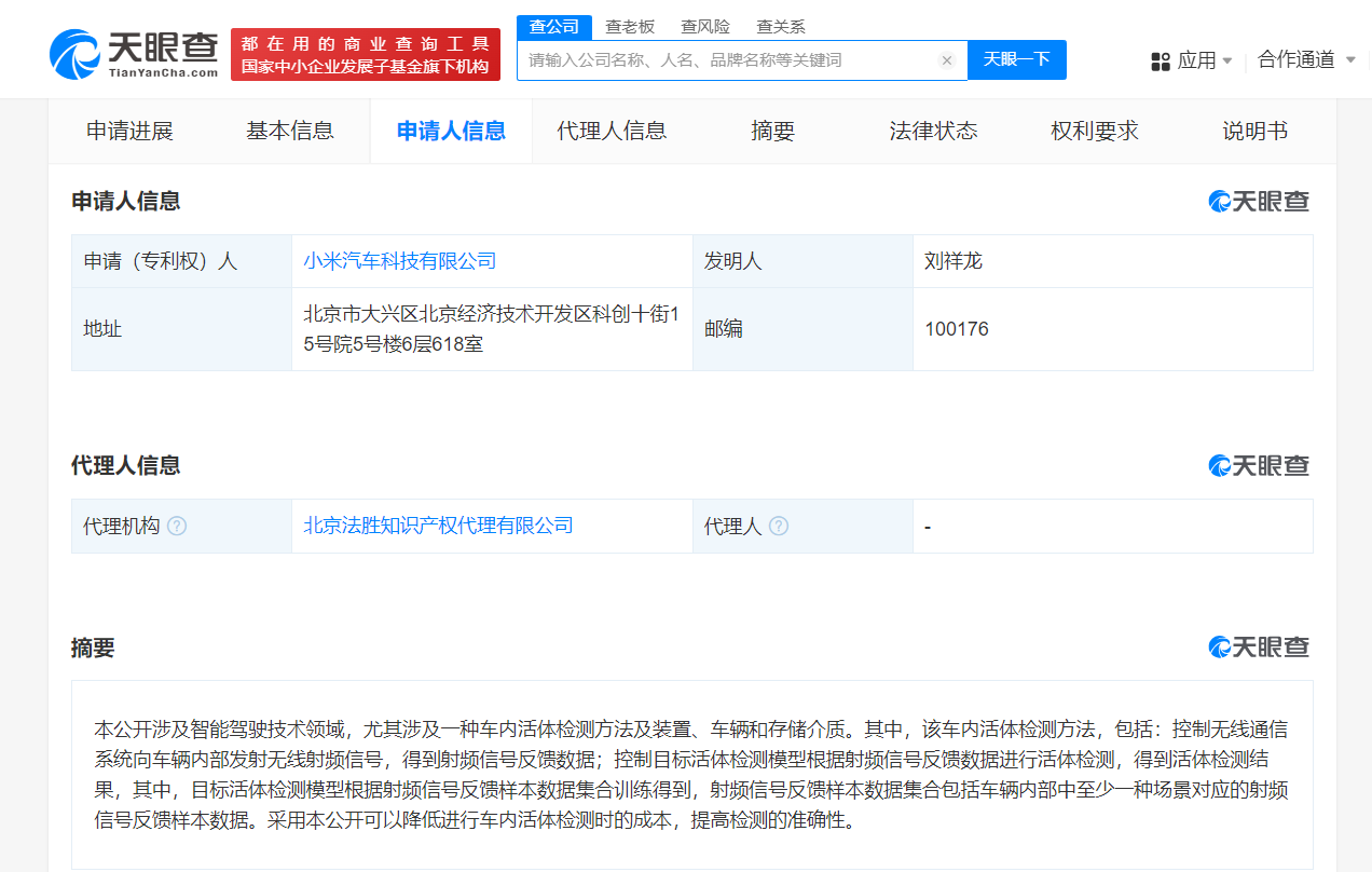天眼查知识产权信息显示,近日,小米汽车科技有限公司申请的“车内活体检测方法及装置、车辆和存储介质”专利公布。