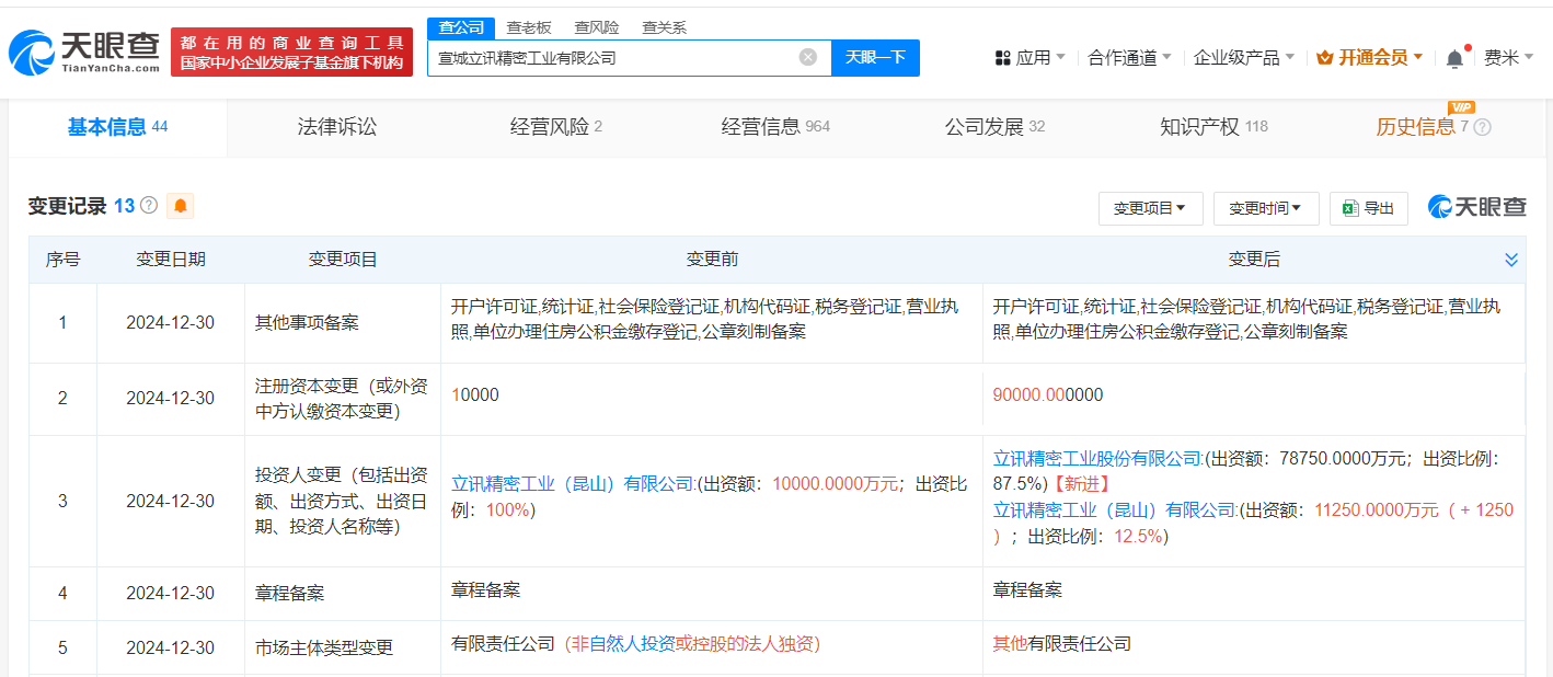 天眼查App显示,近日,宣城立讯精密工业有限公司发生工商变更,新增立讯精密(002475)为股东,同时注册资本由1亿人民币增至9亿人民币,增幅800%。