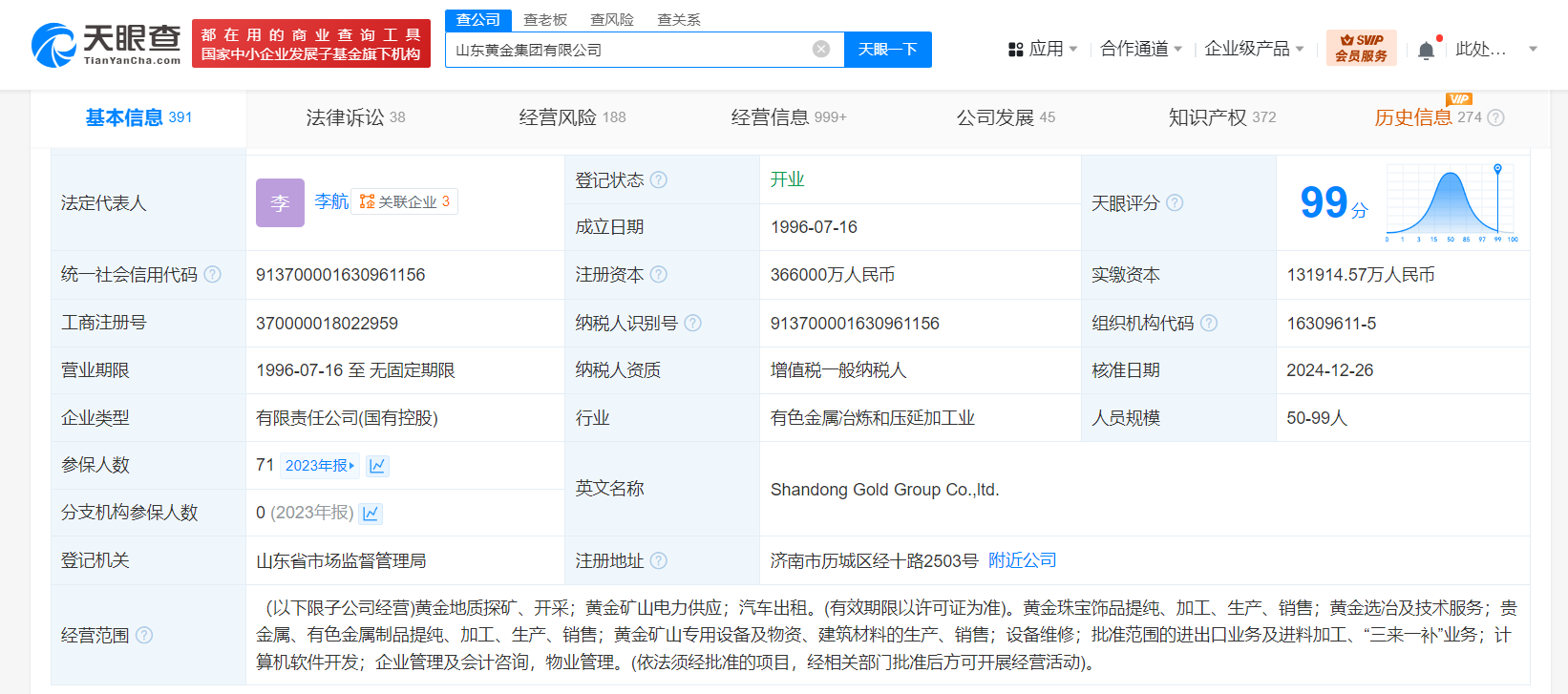 该公司成立于1996年7月,法定代表人为李航,经营范围含黄金地质探矿、开采,黄金矿山电力供应,黄金选冶及技术服务,贵金属、有色金属制品提纯、加工、生产、销售等。股东信息显示,该公司由山东省人民政府国有资产监督管理委员会、山东国惠投资控股集团有限公司、山东省财欣资产运营有限公司共同持股。