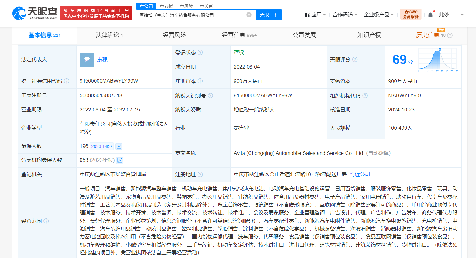 阿维塔(重庆)汽车销售服务有限公司成立于2022年8月,法定代表人为袁稞,注册资本900万人民币,经营范围含汽车销售、新能源汽车整车销售、机动车充电销售、集中式快速充电站、电动汽车充电基础设施运营等,由阿维塔科技(重庆)有限公司全资持股。