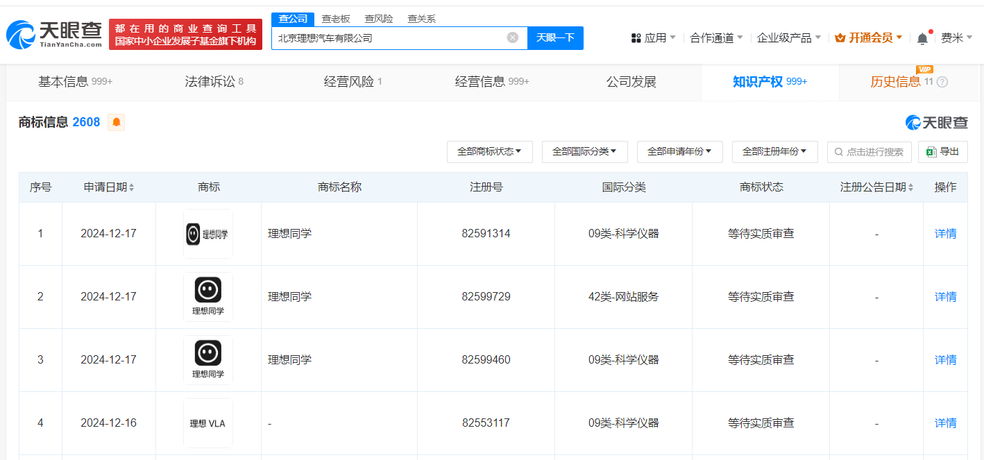 天眼查知识产权信息显示,近日,北京理想汽车有限公司申请注册一枚“理想VLA”商标,国际分类为科学仪器,当前商标状态为等待实质审查。