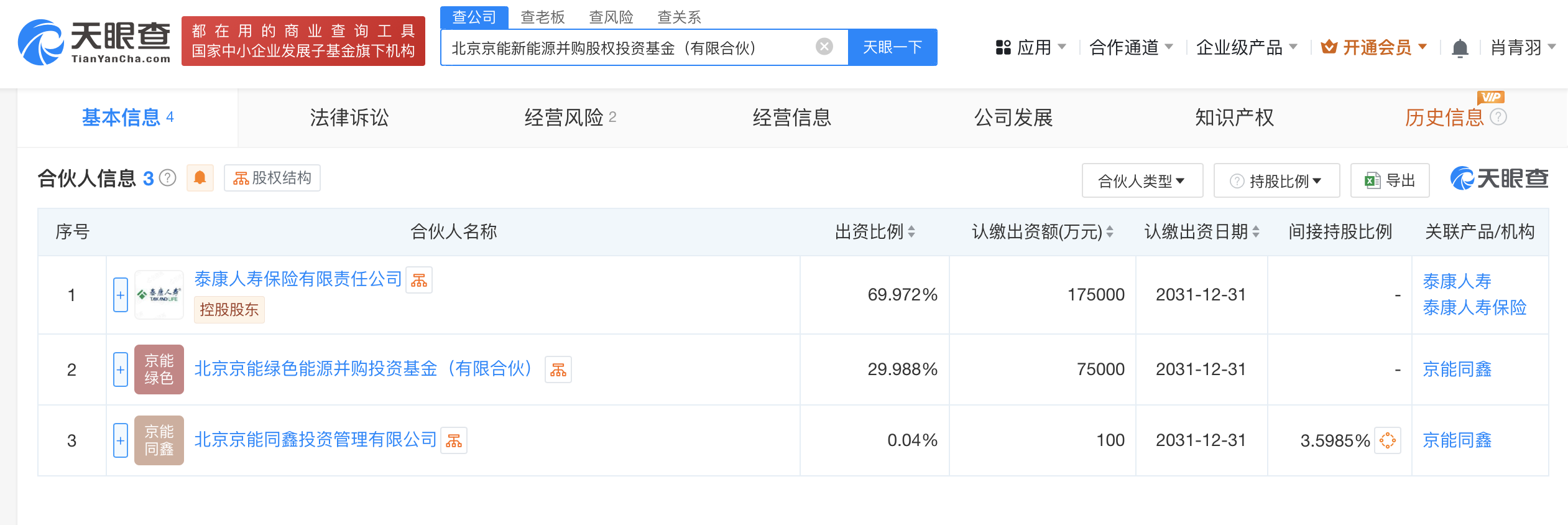 天眼查App显示,近日,北京京能新能源并购股权投资基金(有限合伙)成立,执行事务合伙人为北京京能同鑫投资管理有限公司,出资额约25亿人民币,经营范围为以自有资金从事投资活动,以私募基金从事股权投资、投资管理、资产管理等活动,信息咨询服务。合伙人信息显示,该基金由泰康人寿保险有限责任公司、北京京能绿色能源并购投资基金(有限合伙)、北京京能同鑫投资管理有限公司共同出资。