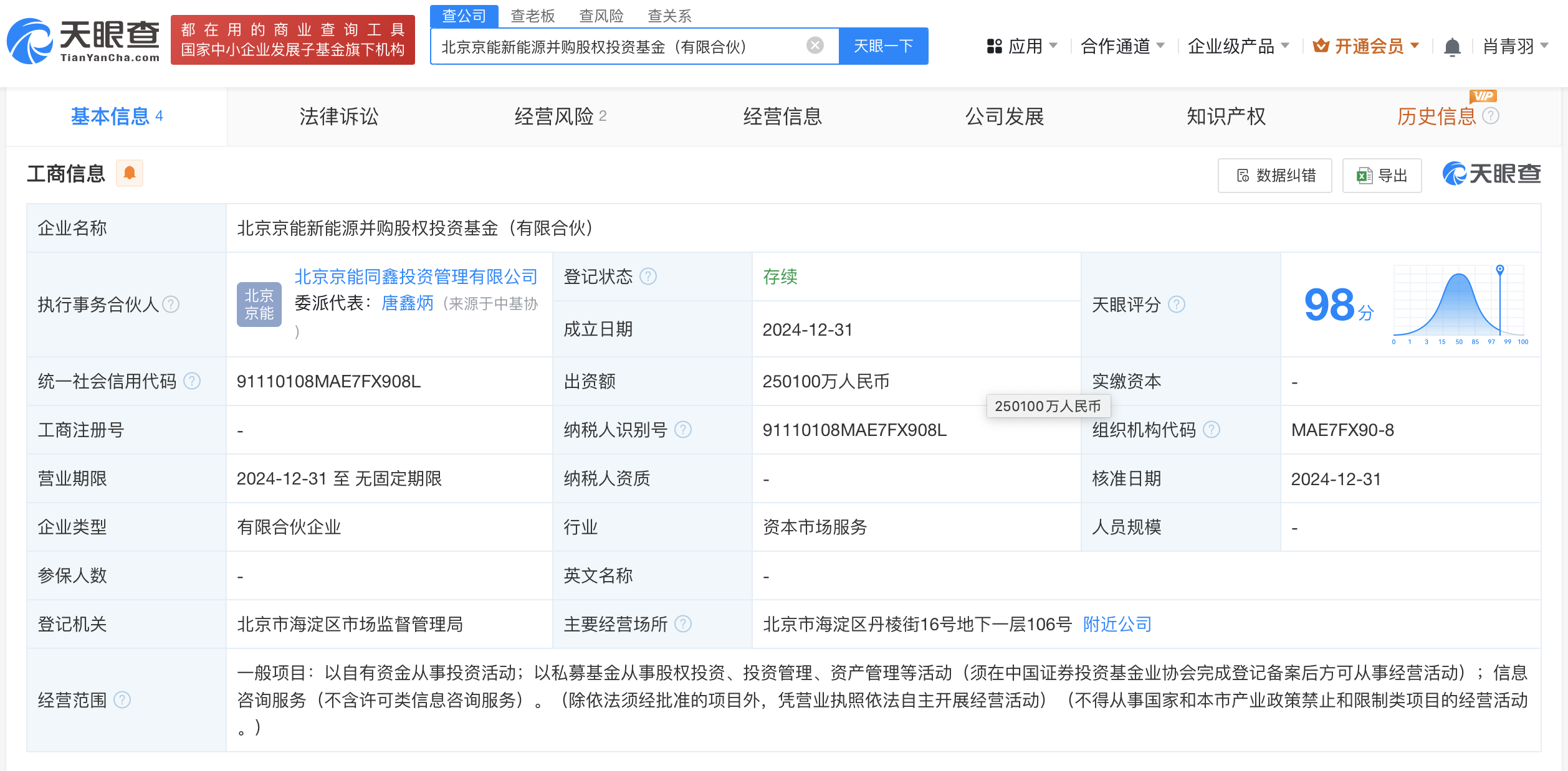 天眼查App显示,近日,北京京能新能源并购股权投资基金(有限合伙)成立,执行事务合伙人为北京京能同鑫投资管理有限公司,出资额约25亿人民币,经营范围为以自有资金从事投资活动,以私募基金从事股权投资、投资管理、资产管理等活动,信息咨询服务。合伙人信息显示,该基金由泰康人寿保险有限责任公司、北京京能绿色能源并购投资基金(有限合伙)、北京京能同鑫投资管理有限公司共同出资。