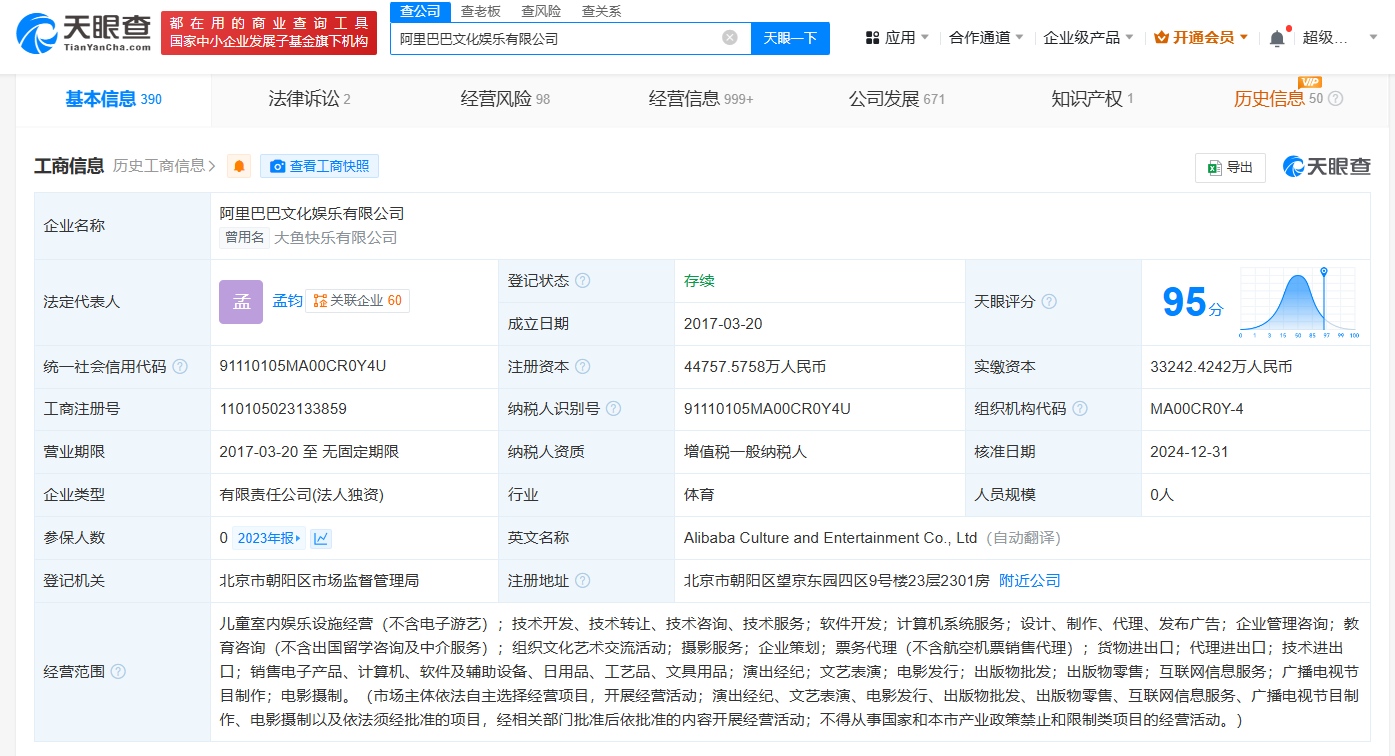 天眼查App显示,近日,阿里巴巴文化娱乐有限公司发生工商变更,注册资本由约1.68亿人民币增至约4.48亿人民币。