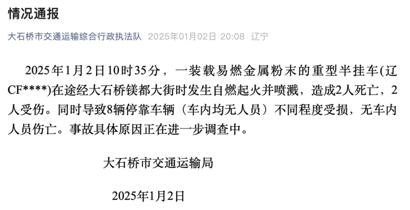 2025年1月2日10时35分,一装载易燃金属粉末的重型半挂车(辽CF****)在途经大石桥镁都大街时发生自燃起火并喷溅,造成2人死亡,2人受伤。同时导致8辆停靠车辆(车内均无人员)不同程度受损,无车内人员伤亡。事故具体原因正在进一步调查中。
