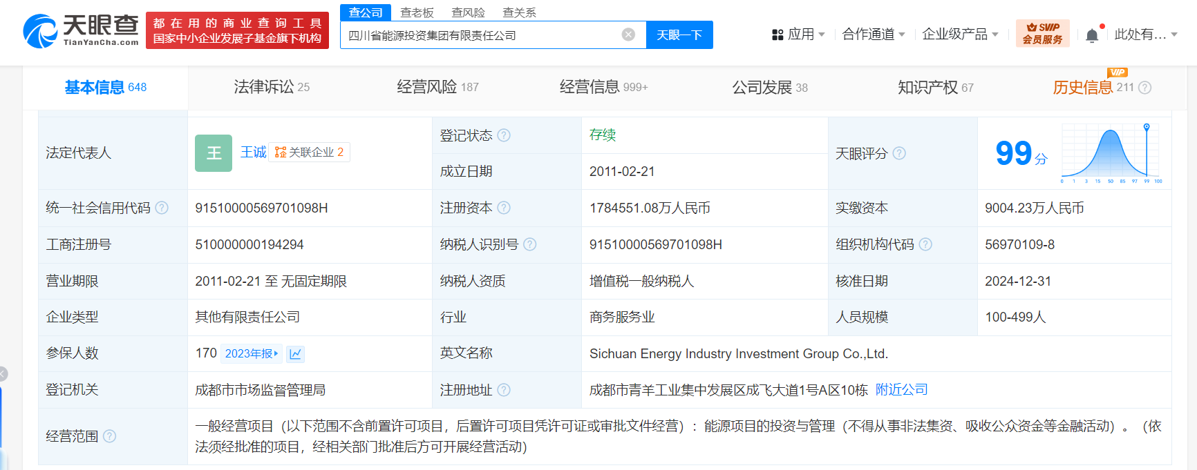 天眼查App显示,近日,四川省能源投资集团有限责任公司发生工商变更,新增四川省政府国有资产监督管理委员会为股东,同时,注册资本由98.89亿人民币增至约178.46亿人民币,增幅约80.46%。