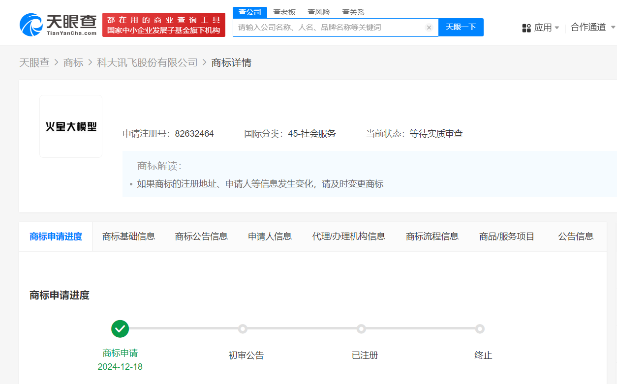 天眼查知识产权信息显示,近日,科大讯飞股份有限公司申请注册“火星大模型”商标,国际分类为社会服务,当前商标状态为等待实质审查。