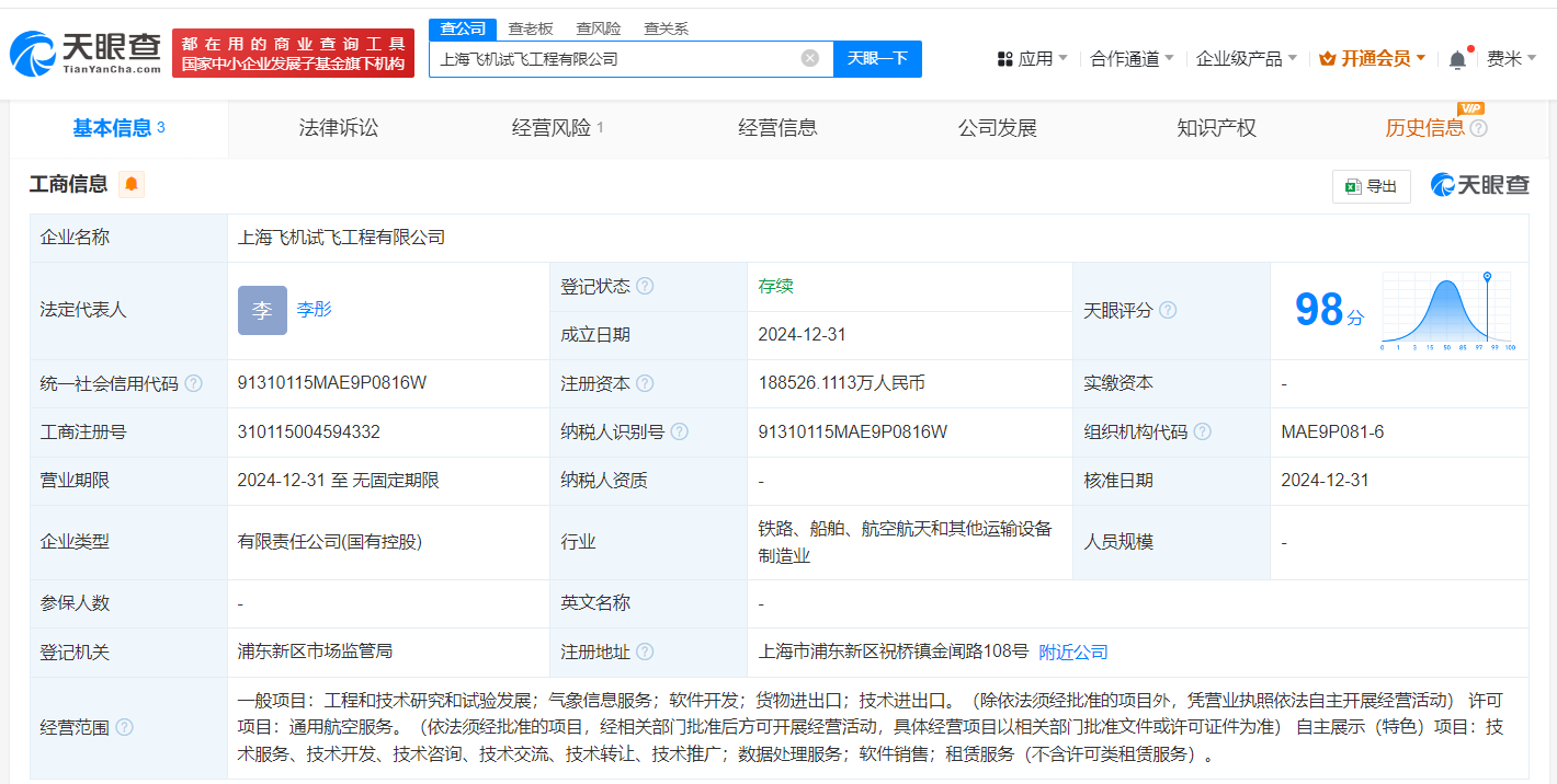 天眼查App显示,近日,上海飞机试飞工程有限公司成立,法定代表人为李彤,注册资本约18.9亿人民币,经营范围含工程和技术研究和试验发展、气象信息服务、通用航空服务、数据处理服务、软件销售、租赁服务等,由中国商用飞机有限责任公司全资持股。