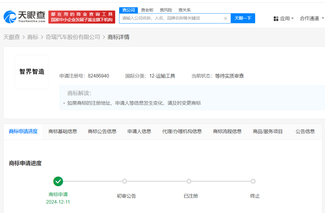 天眼查知识产权信息显示,近日,奇瑞汽车股份有限公司申请注册一枚“智界智造”商标,国际分类为运输工具,当前商标状态为等待实质审查。