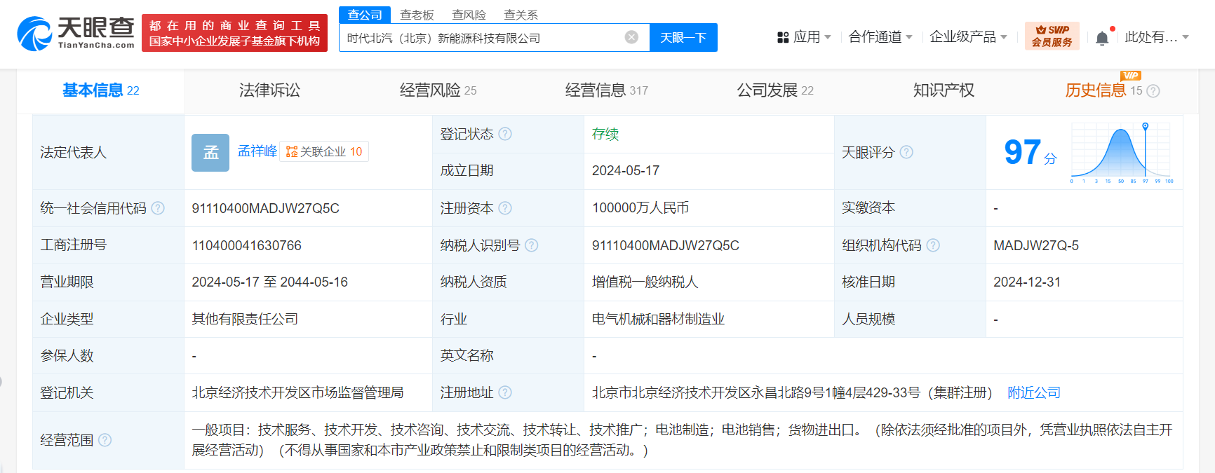 该公司成立于2024年5月,法定代表人为孟祥峰,注册资本10亿人民币,由宁德时代(300750)、北汽海蓝芯能源科技(北京)有限公司、小米汽车科技有限公司、北京京能科技有限公司共同持股。