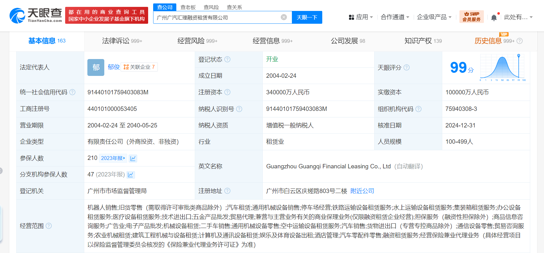 广州广汽汇理融资租赁有限公司成立于2004年2月,法定代表人为郁俊,经营范围含机器人销售、汽车租赁、商品信息咨询服务、二手车销售、货物进出口、通信设备零售、汽车零配件零售等。股东信息显示,该公司现由广汽集团(601238)旗下广汽商贸有限公司以及东方汇理个人金融股份有限公司CA CONSUMER FINANCE各持股50%。