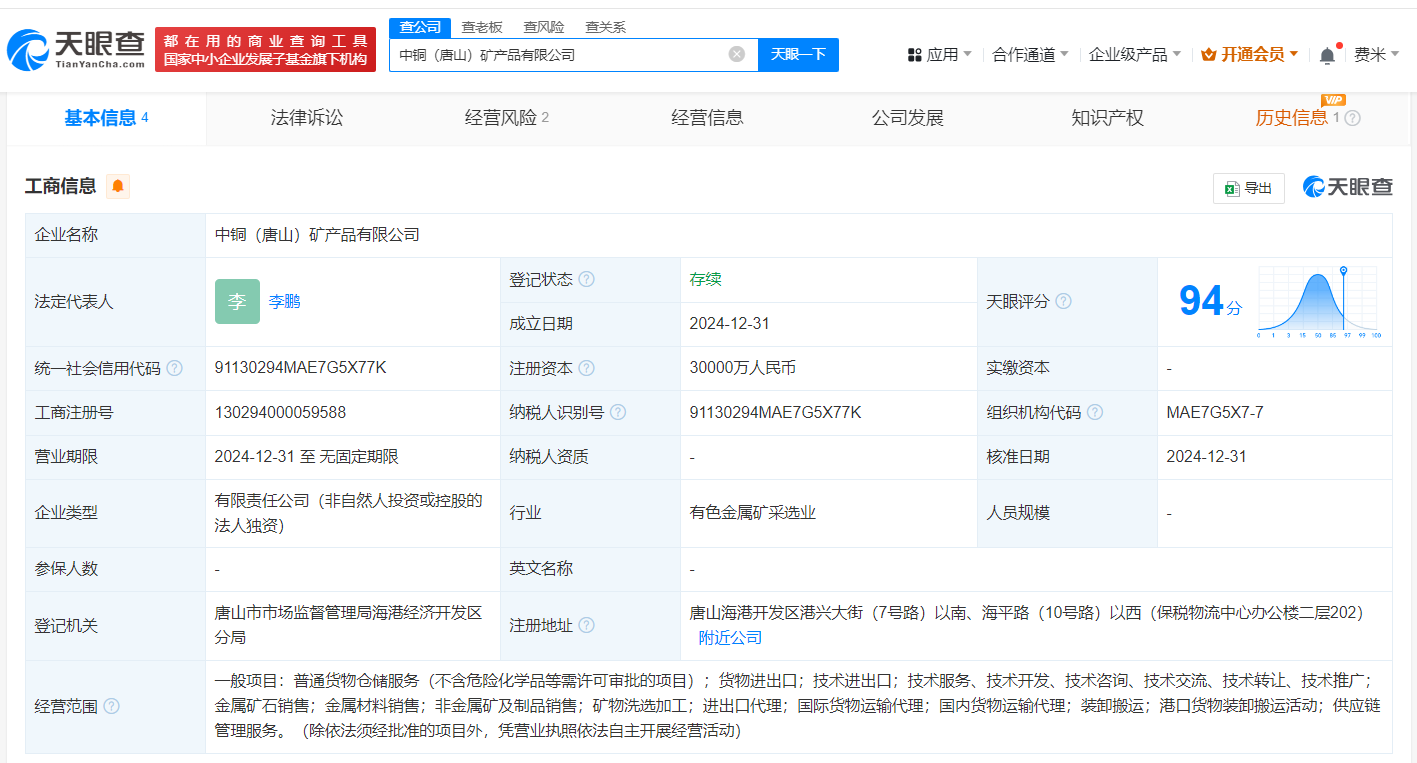 天眼查App显示,近日,中铜(唐山)矿产品有限公司成立,法定代表人为李鹏,注册资本3亿人民币,经营范围含普通货物仓储服务、金属矿石销售、金属材料销售、非金属矿及制品销售、矿物洗选加工、进出口代理等,由中国铜业有限公司全资持股。
