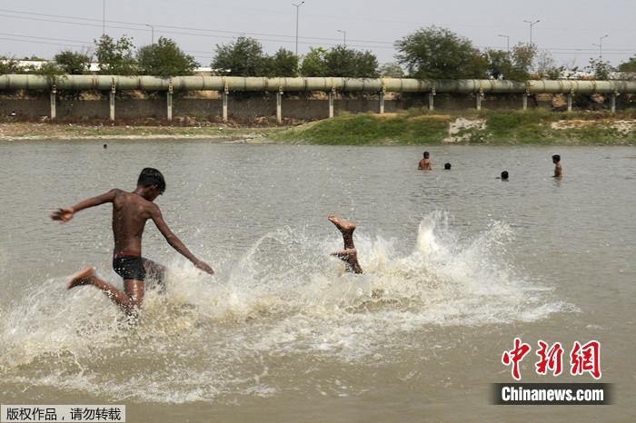 2024 年5月27日,印度新德里,气温升高,孩子们在湖中纳凉。