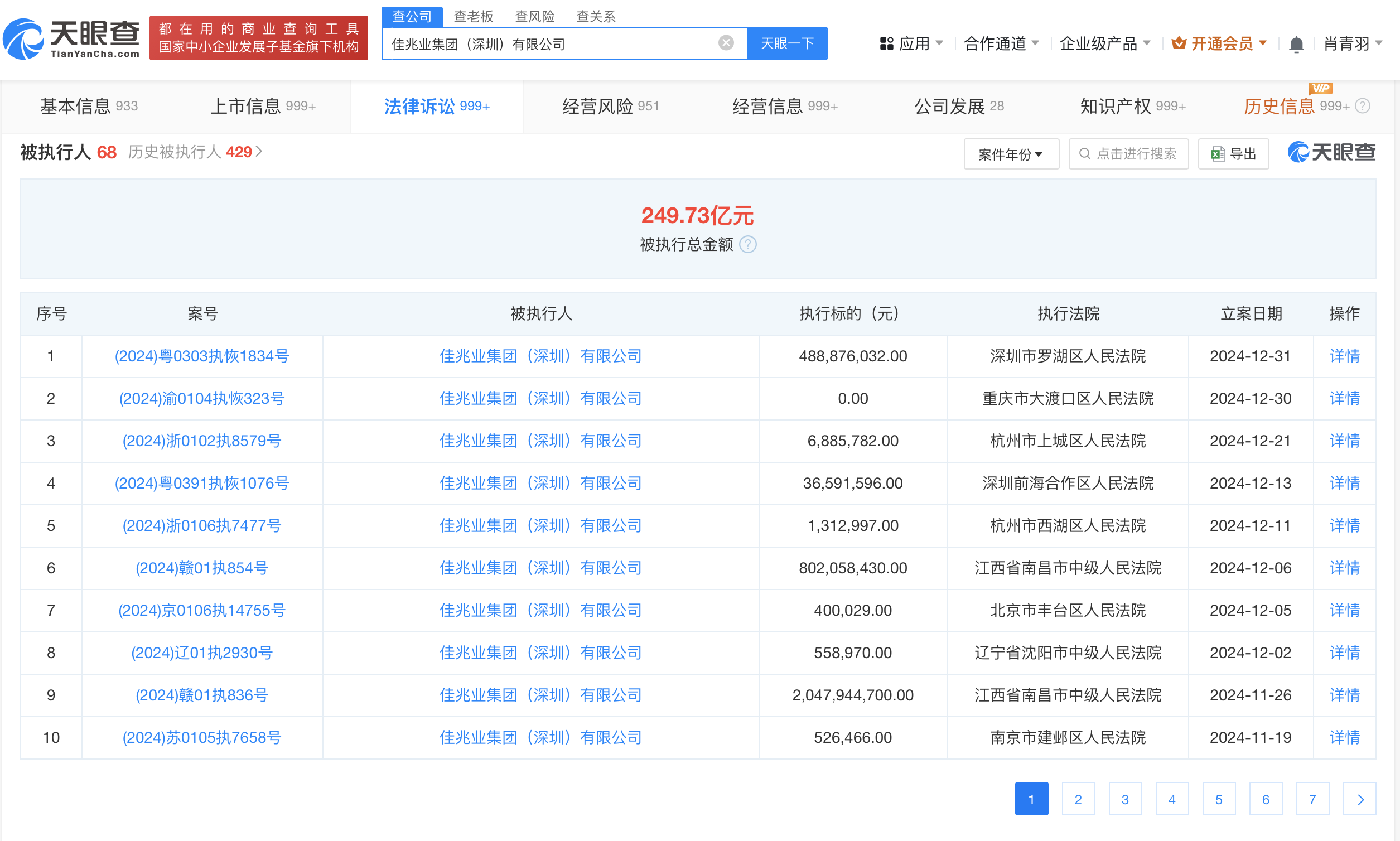 天眼风险信息显示,佳兆业集团(深圳)有限公司现存60余条被执行人信息,被执行总金额超249亿元,此外,该公司还存在多条限制消费令、失信被执行人(老赖)及终本案件信息。