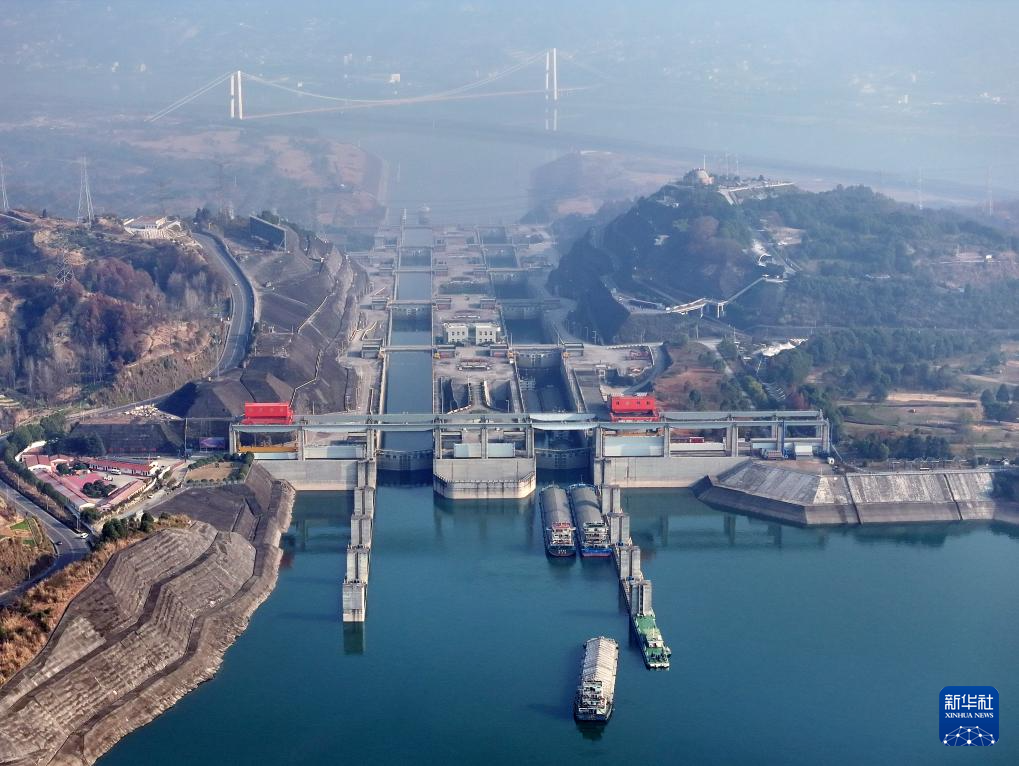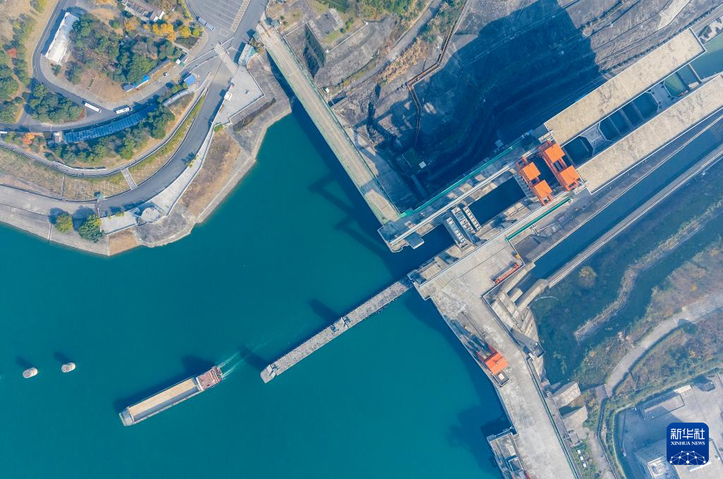 2025年1月1日,在湖北省宜昌市,船舶有序通过三峡枢纽五级船闸(无人机照片)。新华社发(王罡摄)